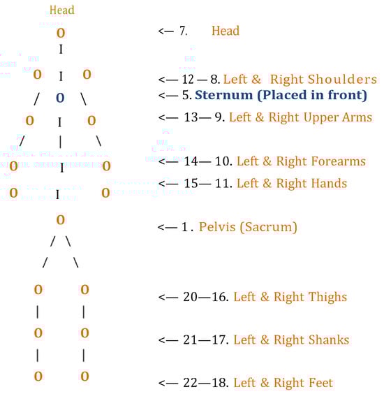 The 17 IMUs were positioned at the following anatomical locations: head, upper back (T3), lower back (L5), pelvis (sacrum), left and right upper arms, left and right forearms, left and right hands, left and right thighs (mid-femur), left and right shanks (mid-tibia), and left and right feet (dorsal surface). Sensors were placed on prominent bony landmarks such as the hip (greater trochanter), knee (medial epicondyle), and ankle (lateral malleolus). Sensor locations were fine-tuned in the software prior to calibration by measuring the distances between sensors and the corresponding anatomical landmarks to enhance accuracy as shown in