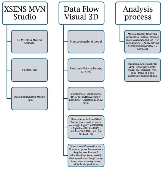 The block diagram illustrating the data processing pipeline for gait analysis using Xsens MVN Studio and Visual3D is presented in