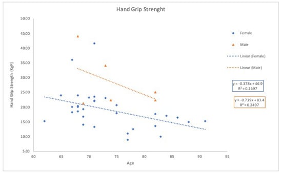 Moreover, grip strength analysis revealed an age-related decline, with men generally showing higher values than women. However, the grip strength values for men in this study were slightly lower than those reported in previous literature [
