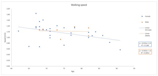 Figure 5 further suggests a greater decline in walking speed for females, though conclusions are limited due to the small male representation.