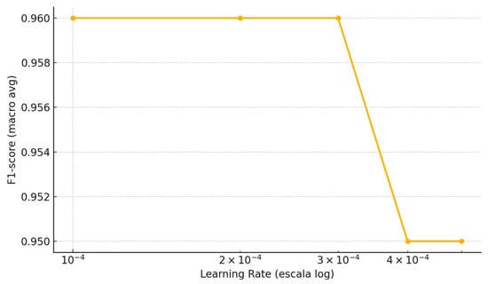 Table 2, a clear trend can be observed in which models trained with higher-resolution images (1024 × 1024) show progressively better performance as the number of epochs increases. Although models at a resolution of 512 × 512 achieve higher accuracy and F1-score values in less training time, it is evident that the 1024 × 1024 models display continuous and sustained improvement, suggesting a greater generalization capacity as hyperparameters are optimized. Therefore, the 1024 × 1024 resolution model is established as the baseline for exploring different learning rates, with the goal of identifying the optimal configuration for subsequent experiments with mixed data (real + synthetic).