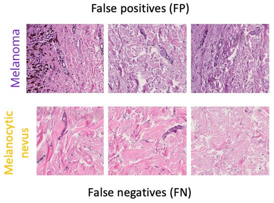 Figure 8 highlights cases where the classifier fails to distinguish between malignant melanoma and melanocytic nevus. Some false negatives present structures reminiscent of benign tissue, with little cellular atypia or faint chromatic distribution, which can lead to classification errors. On the other hand, certain false positives exhibit areas of hyperchromasia or local disorganization that could resemble typical malignancy patterns. These errors reflect the inherent difficulty of discriminating between histologically similar entities, especially in borderline or morphologically ambiguous regions.