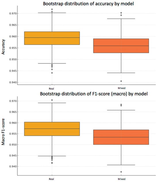 From the predictions of both models —one trained exclusively with real data and the other with a mixed dataset of real and synthetic data— accuracy and macro F1-score were calculated in each iteration.