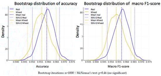 In addition to the statistical analysis using McNemar’s test, a bootstrap strategy was applied to estimate the variability of the performance metrics and assess their robustness. This technique consists of generating subsets of the test set through resampling with replacement, repeating the evaluation process multiple times (n = 1000 in this case).