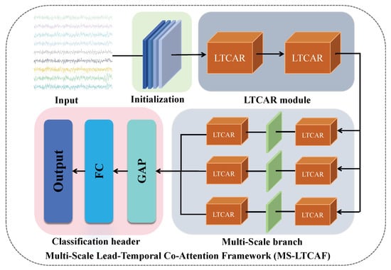 The simultaneous extraction and analysis of intra-lead and inter-lead features can further improve the performance of multi-lead ECG diagnostic classification models. At the same time, the application of a dual-attention mechanism allows the model to focus on the most important information while ignoring less relevant features, thereby reducing information redundancy. To achieve this, we built a Multi-Scale Lead-Temporal Co-Attention Framework (MS-LTCAF). The signal is input into the MS-LTCAF, processed by Lead-Temporal Co-Attention Residual (LTCAR) Module and a multi-scale branch structure, and then sent to the classification head to output the results.