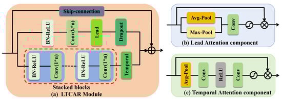 Subsequently, the output of the initialization layer flows into the first LTCAR module, each containing two paths. Path 1 is based on (k, n) convolutional kernels to compress along the center, and at the same time, lead attention is added to automatically learn the correlation between leads, and capture the synergistic effect of different lead combinations on specific pathological features. Path 2 is based on stacked m (1, n) convolutional kernels compressed along the time dimension, increasing the global channel dependence of temporal attention modeling, dynamically calibrating the importance of multi-channel features, and making up for the local limitation of convolution. At the same time, the model’s joint modeling ability of ECG local waveform and global rhythm is improved through jump connection.