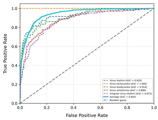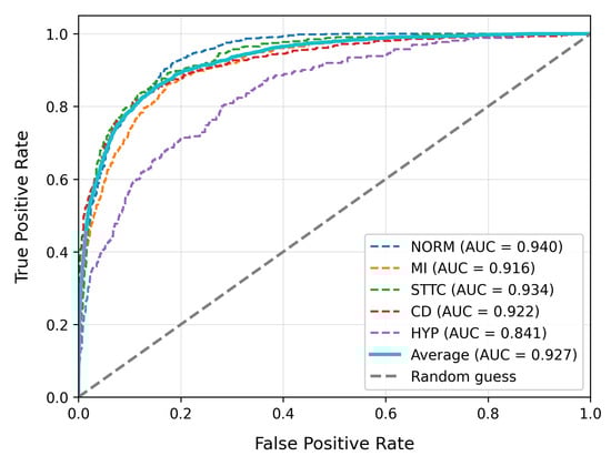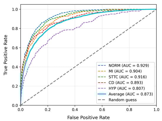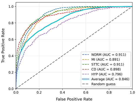 Table 4 presents specific ECG type evaluation metrics on the PTB_XL dataset. The model demonstrates satisfactory classification performance across most categories, with the highest F1-score (0.84) achieved for the Norm type, accompanied by precision and recall rates of 0.83 and 0.86, respectively. This indicates strong capability in identifying normal ECGs. However, metrics for the HYP category are notably lower (F1 = 0.39, Recall = 0.27). This discrepancy may stem from the fact that ECG alterations associated with hypertension often overlap with other clinical conditions, resulting in higher feature complexity that impairs the classifier’s discriminative power.