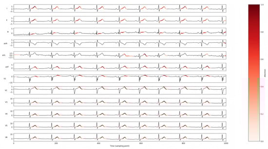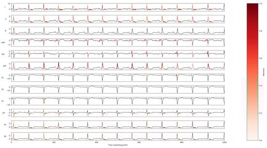 The experimental findings confirm the synergistic effect of combining lead attention and temporal attention, which can effectively enhance the model’s ability to extract and discriminate complex features, and then significantly improve the classification performance. Furthermore, through the visualization results, the role of the attention mechanism can be further verified, and the focused feature areas between and within different leads can be visually displayed.