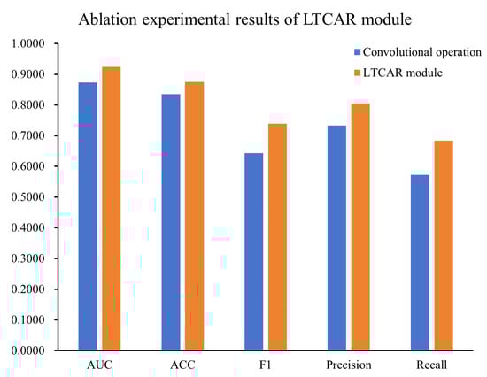 In classification tasks involving spatiotemporal features such as ECG, the LTCAR module used in our framework contributes to improving model performance through dual-path convolution. To evaluate the effectiveness of the LTCAR module, we replaced it with a convolutional operation while keeping the overall architecture of the model, training strategy, and hyperparameter configuration completely consistent to ensure the rigor of the experiment. The experimental results are shown in