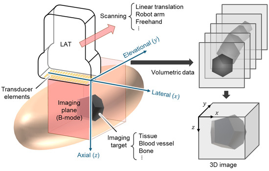 Among these approaches, linear-array-based volumetric USI has emerged as a highly practical and adaptable solution. Linear array transducers (LATs) are already ubiquitous in clinical settings and benefit from mature fabrication processes, standardized interfaces, and broad system compatibility. LATs are composed of numerous small piezoelectric elements (typically 128–256) arranged linearly (Figure 1). The acoustic beamlines generated by LATs produce rectangular-shaped B-mode images with uniform beam density. This configuration offers an excellent near-field resolution, particularly advantageous for imaging superficial anatomical structures. LAT-based USI conventionally generates cross-sectional () B-mode images. To reconstruct 3D volumes, additional scanning in the elevational () direction is required. By integrating advanced scanning strategies, LATs can be repurposed for 3D image acquisition with relatively modest hardware modifications.