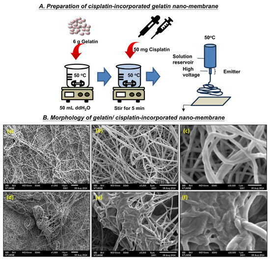 Preparation and morphology of cisplatin-incorporated gelatin nanomembrane. (A) Schematic of the electrospinning process used to fabricate cisplatin-loaded gelatin nanofibers. (B) Schematic representation of nanofibers. SEM images showing the morphology of the nanomembranes. Smooth, interconnected fibers were observed, with average diameters of 150 ± 50 nm (scale bars = 5 µm). (a–c) Pure gelatin nanofibers; (e–f) cisplatin-loaded gelatin nanofibers.