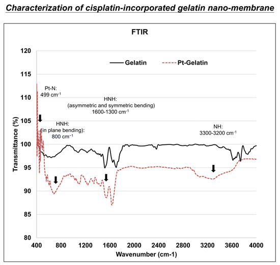 FTIR characterization of cisplatin-incorporated gelatin nanofibers, showing key spectral shifts indicative of drug–polymer interactions. Characteristic spectral changes were observed, particularly in the following regions: 3300–3200 cm−1 (asymmetric and symmetric stretching of NH groups), 1600–1300 cm−1 (asymmetric and symmetric bending of H-NH) region, around 800 cm−1 (H-NH in-plane bending), and 499 cm−1 (Pt-N stretching vibration).