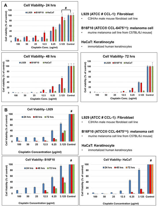 Our results showed that all cell types had better cell viability at lower cisplatin concentrations, while the cell viability of B16F10 (melanoma) cells appeared higher than that of L929 (fibroblast) cells and HaCaT (keratinocyte) cells. The cell viability decreased as the period of cisplatin incubation increased; at 24 hours of cisplatin incubation, the cell viability of all three cell types was still higher than 60% (n = 4; #: p > 0.05).
