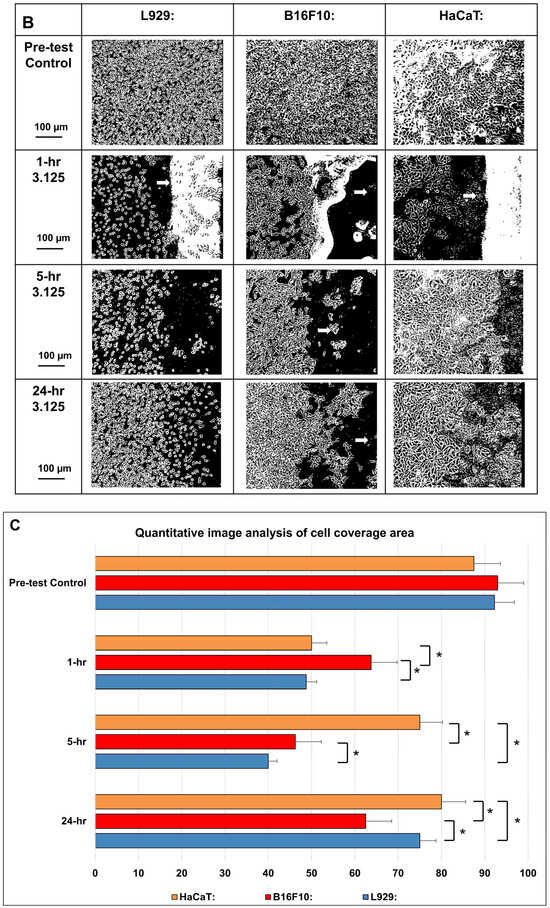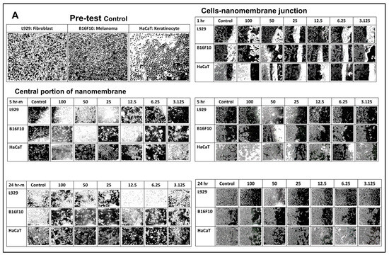 The local interaction between different cell types and cisplatin-incorporated nanomembrane were demonstrated at Figure 5. At 1 h after nanomembrane application, shrinkage of cells was observed in all cell populations near the junction, while the cells within the coverage of the nanomembrane showed severe shrinkage, with some cell debris visible. At 5 h after nanomembrane application, shrinkage of cells was still observed in cell populations near the junction for the control samples, while the recovery of cell populations within the coverage of the nanomembrane showed some improvement, especially for the L929 and HaCaT cells. At 24 h after cisplatin-incorporated nanomembrane application, the shrinkage of cells kept improving in cell populations near the junction, while the recovery of cell populations within the coverage of the nanomembrane showed nearly complete recovery for the control samples. The cytotoxic effect was more obvious in the B16F10 cells, especially at the highest concentration, whereas at the lower concentrations (6.25/3.125), the cytotoxic effect on L929 and HaCaT cells seemed less obvious (Figure 5A,B).