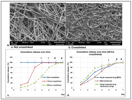 The morphology of non-cross-linked and cross-linked nanomembranes is shown in Figure 6A(a,b). As shown in Figure 6A(b), the cross-linked nanofibers kept their smooth surface, porous structures, and interconnectivity, but there were some changes in the porosity. In the present study of dissolution profiles, as shown in Figure 6A(c,d),B(e,f), all the formulations have shown more than 95% of drugs being released within 7 days in 0.05 M phosphate buffer pH 7.4. From the observations, the non-cross-linked medication achieved a drug release of more than 98% within 24 h, whereas the 48 h cross-linked sample was only able to achieve 20% drug release within 72 h (Figure 6A(c)). From the dissolution studies, all samples showed a higher percentage of drug release as dissolution time increased, achieving more than 95% by day 7 (Figure 6A(c)). In comparison of all the formulations, although individual variations existed, smaller molecules usually dissolved faster than macromolecules (Figure 6A(d)). When the same bioactive material was cross-linked at different combinations of cross-linking time, a controllable and stable release profile could be achieved (Figure 6B(e,f)). As shown, the nanomembrane is proven to be a suitable dissolution scaffold with an acceptable discriminating power.
