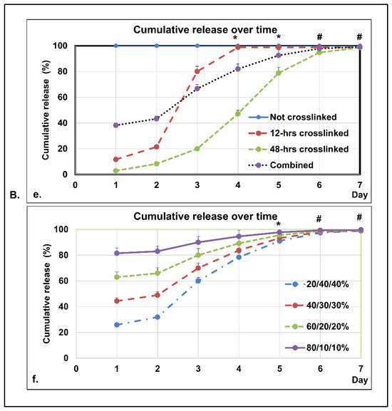 Cumulative release profile of ketoprofen and different molecules with/without cross-linking, and a schematic representation of the cross-linking. (A): (a) cross-linked and (b) non-cross-linked (scale bars = 5 µm). (c–f) Cumulative release over 7 days: (c) cumulative release over time at 12 or 48 h cross-linked for the same bioactive materials (ketoprofen); (d) cumulative release over time at 48 h cross-linked for different bioactive materials (MET: metformin, anticancer drug: 5-fluorouracil, macromolecule: exosomes); (B): (e) cumulative release over time for the same bioactive materials at different cross-linking time; (f) cumulative release over time for the same bioactive materials at different combination ratio of cross-linking time. When the same bioactive material was cross-linked at different combination ratios of cross-linking time, a controllable and stable release profile could be achieved. (Data are shown as percentage of non-cross-linked/12 h cross-linked/48 h cross-linked). All the formulations have shown more than 95% of drugs being released within 7 days; each data point represents the average of 4 samples from 4 batches (n = 4; *: p > 0.05 between 2 groups; #: p > 0.05 between all groups).