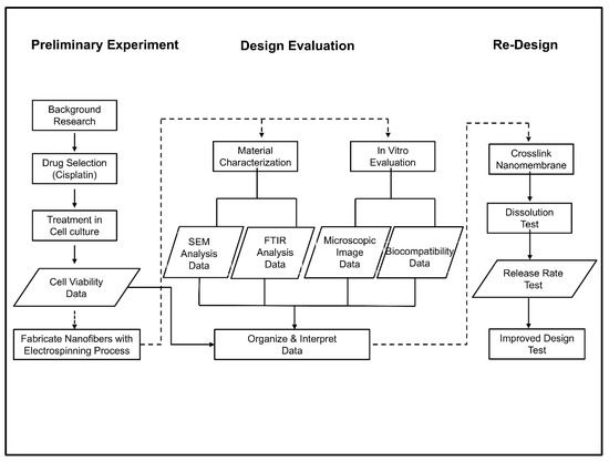 The design process starts with preliminary experimentation to study the cytotoxicity of cisplatin to cell cultures at different concentrations, and the resulting data guide the fabrication of drug-carrying nanomembranes. The nanomembranes are then characterized and evaluated in vitro with cell cultures; then, the nanomembrane is redesigned (Figure 1 and Scheme 1).