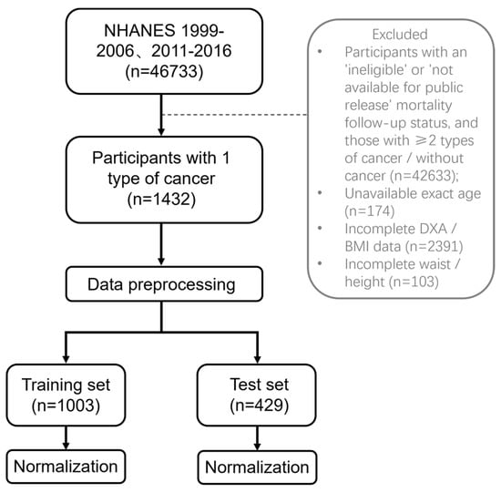 For this cross-sectional study, we merged available data from 1999 to 2006 and 2011 to 2016. All included participants underwent dual-energy X-ray absorptiometry (DXA) measurements. Exclusion criteria were (1) status for mortality follow-up ineligible and not available for public release, (2) participants with ≥2 types of cancer or without cancer, (3) participants with age recorded as “80 years or older” or “85 years or older”, resulting in unavailable exact age, (4) incomplete DXA or BMI data, (5) incomplete waist circumference or height data. After the screening, there were 1432 participants included (Figure 1). The reason for excluding 2007 to 2010 is the absence of whole-body DXA data; only femur and spine data are available. The cancer types includes bladder, blood, bone, brain, breast, cervix, colon, esophagus, gallbladder, kidney, larynx/ trachea, leukemia, liver, lung, lymphoma/Hodgkin’s disease, melanoma, mouth/tongue/lip, nervous system, ovary, pancreas, prostate, rectum, skin (non-melanoma), skin (unknown), soft tissue (muscle or fat), stomach, testis, thyroid, uterus, other.