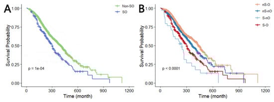 Kaplan–Meier curve of OS (log-rank test: p = 0.0001). (A,B) Survival curves when the total population is divided into two and four categories. Abbreviations: dichotomous taxonomy of SO: SO, sarcopenic obesity; Non-SO, non-sarcopenic obesity; Quadruple taxonomy of SO: nS-nO, non-sarcopenia and non-obesity; nS-O, non-sarcopenia and obesity; S-O, sarcopenia and obesity; S-nO, sarcopenia and non-obesity.