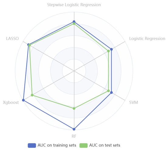 Notably, employing the LASSO method for selecting the top 20 features to construct a model resulted in the highest AUC of 0.858 on the test set. Following LASSO, the stepwise logistic regression model (AUC= 0.804 on the test set) and the logistic regression (AUC= 0.675 on the test set) achieved the second and third highest AUC after feature selection. However, the RF model underwent a 10-fold cross-validation process, and the AUC values were 0.990 on the training set and 0.637 on the test set. Similarly, after grid search and 10-fold cross-validation, the AUC values of XGBoost on the training set were 0.993 and 0.821 on the test set. The results of RF and XGBoost indicated overfitting of the training set, as both models demonstrated overly optimistic performance on the training data but showed comparatively poorer performance on the unseen test data (Table 9).