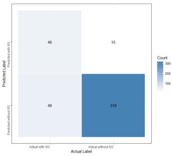 In our study, six commonly used single-model machine learning algorithms—logistic regression, stepwise logistic regression, least absolute shrinkage and selection operator (LASSO), support vector machine (SVM), random forest (RF), and extreme gradient boosting (XGBoost)—were employed to predict the presence of SO. We first used the training set to construct models. After constructing the model using 108 independent variables from the training set, we ranked each feature’s contribution to predicting the presence of SO. Based on the importance ranking, the feature selection process involved choosing the top 10, 15, and 20 features to be reintroduced into the respective models. We retrained the model using the top 10, 15, and 20 features as inputs and conducted hyperparameter tuning. For the LASSO model, we used 10-fold cross-validation to identify the optimal regularization parameter. For SVM, we evaluated four different kernel functions and ultimately chose the linear kernel, as it showed the best performance. Then, 10-fold cross-validation was employed to evaluate the performance of each C parameter (C parameter =10). For the RF model, we optimized the mtry and ntree parameters by using 10-fold cross-validation to enhance accuracy and reliability (mtry = 130, ntree = 15). Regarding the XGBoost model, a range of parameters, including the number of boosting rounds, maximum depth of trees, learning rate, gamma, sample and feature subsampling proportions, and minimum child weight, were optimized by 10-fold cross-validation (number of boosting rounds = 20, maximum depth of trees = 5, learning rate = 0.1, gamma = 0, colsample_bytree = 1, subsample = 0.7, minimum child weight = 1). We applied the models on the test set to evaluate their predictive performance, assessing the performance on unseen data to evaluate their generalization capability.