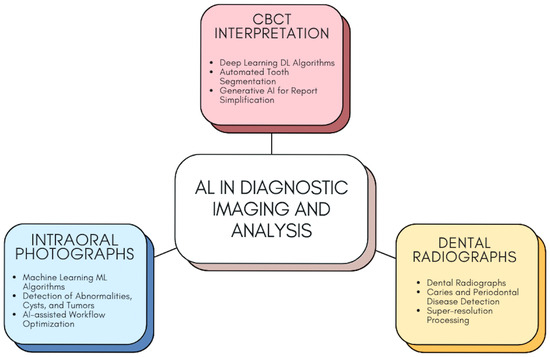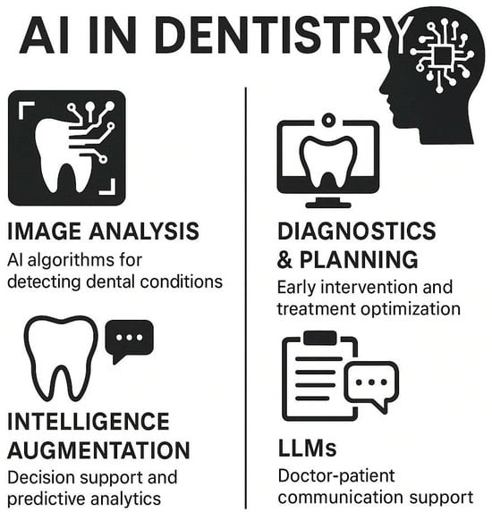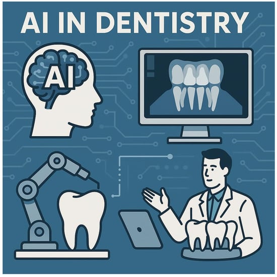 - Alzaid, N.; Ghulam, O.; Albani, M.; Alharbi, R.; Othman, M.; Taher, H.; Albaradie, S.; Ahmed, S. Revolutionizing Dental Care: A Comprehensive Review of Artificial Intelligence Applications Among Various Dental Specialties. Cureus 2023, 15, e47033. [Google Scholar] [CrossRef]