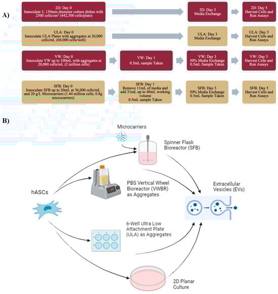 - Jeske, R.; Liu, C.; Duke, L.; Canonicco Castro, M.L.; Muok, L.; Arthur, P.; Singh, M.; Jung, S.; Sun, L.; Li, Y. Upscaling human mesenchymal stromal cell production in a novel vertical-wheel bioreactor enhances extracellular vesicle secretion and cargo profile. Bioact. Mater. 2022, 25, 732–747. (In English) [Google Scholar] [CrossRef]