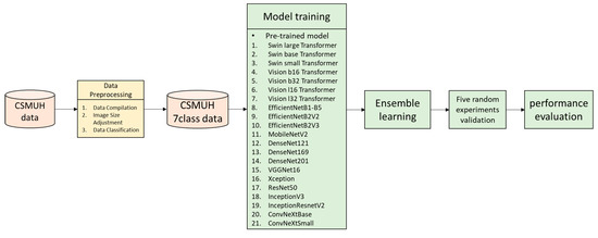 Figure 1 illustrates the step-by-step workflow of the proposed study. The model development process begins with the CSMUH dataset, which undergoes a series of preprocessing steps, including data compilation, image resizing, and classification into seven distinct skin lesion categories. This results in a structured dataset referred to as CSMUH 7-class data. Subsequently, a diverse set of pre-trained models is fine-tuned. Following individual model training, ensemble learning is employed to integrate the strengths of the top-performing models. The ensemble model is then validated through five randomized experiments to ensure robustness and consistency. Finally, model performance is evaluated using standard metrics to assess its effectiveness in skin lesion classification.