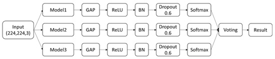 This study builds an ensemble deep learning model based on three pre-trained models, using the voting method. The top three best-performing pre-trained models were selected, followed by the addition of a fully connected layer with a ReLU activation function and a Global Average Pooling (GAP) layer. To avoid overfitting, Batch Normalization (BN) and Dropout layers were added. After obtaining the prediction results from each model for skin lesion classification, a voting process was used to determine the final prediction. The model architecture is illustrated in Figure 2.