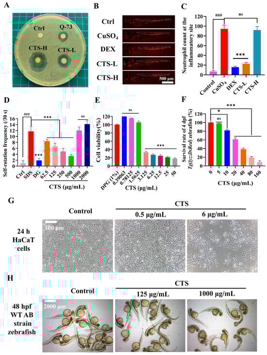 Antimicrobial, anti-inflammatory, and safety profile of CTS. (A) C. acnes inhibition zone (CTS-H 3.0 mg/mL; CTS-L: 1.0 mg/mL); Ctrl: DPG solvent control; Q-73 (Quaternium-73): positive control (1.0 mg/mL) (n = 3). (B,C) Neutrophil distribution in the inflammation model of 3 dpf Tg(lyz:DsRed) zebrafish induced by 20 µM CuSO4. (n = 20); Ctrl: E3 medium; Dex: 5 µg/mL; CTS-L: 40 µg/mL; CTS-H: 200 µg/mL. (D) SDS (500 μM)-induced self-rotation frequency at 24 hpf embryos of WT AB strain zebrafish (n = 16); DG: 1 mM; CTS: 62.5–2000 μg/mL. (E) Cell viability of HaCaT keratinocytes following 24-h incubation with CTS at different concentrations (n = 6). (F) Survival rates of 3 dpf Tg(lyz:DsRed) zebrafish following a 24-h exposure to different concentrations of CTS (n = 12). (G) Representative images of HaCaT cells. (H) Representative images of the teratogenic effects of WT AB strain zebrafish at 48 hpf. Data were presented as mean ± SEM. “###” denoted p < 0.001 compared with the blank control. Wherever included, comparisons with the model group were indicated as n.s. (non-significant, p > 0.05), * p < 0.05, and *** p < 0.001.