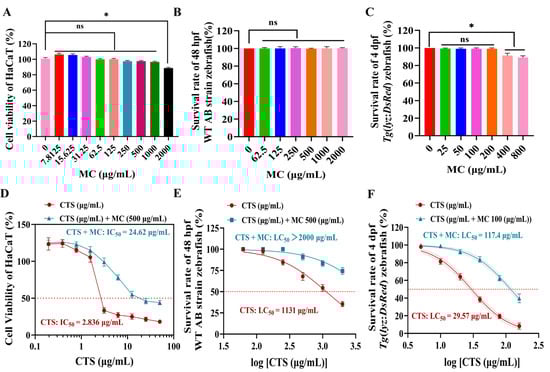 By mitigating high-dose CTS toxicity, MC significantly improved the safety profile of CTS. (A,D) (A) Cell viability of HaCaT keratinocytes following 24-h incubation with MC at different concentrations (n = 6); (D) The cytotoxicity threshold (IC50) in HaCaT keratinocytes (CTS vs. CTS-MC). (B,E) Survival rate and LC50 of WT AB strain zebrafish at 48 hpf (n = 12): (B, MC) and (E, CTS vs. CTS-MC). (C,F) Survival rate and LC50 of Tg(lyz:DsRed) zebrafish at 4 dpf (n = 12): (C, MC) and (F, CTS vs. CTS-MC). Data were presented as mean ± SEM. Wherever included, comparisons with the control group were indicated as n.s. (non-significant, p > 0.05), * p < 0.05.