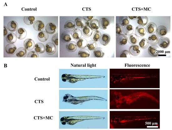 Healthy WT AB zebrafish embryos (24 hpf) and Tg(lyz:DsRed) zebrafish embryos (3 dpf) were collected, randomly grouped (20 per group), and exposed in 24-well plates (2 mL solution per well) to 1% DMSO (control), CTS (5–320 μg/mL), MC (25–1600 μg/mL), or combinations thereof. After 24 h of exposure, individual phenotypes were imaged using a stereo fluorescence microscope (Leica MZ10F, Leica Microsystems, Wetzlar, Germany).