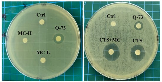 Lawns of C. acnes were established on RCM agar plates, onto which six-mm sterile paper disks were aseptically placed. Three experimental sets were implemented: (1) CTS dose–response: disks received 10 μL of vehicle (DPG), positive control (Q-73, 1 mg/mL), high-dose CTS (3 mg/mL), or low-dose CTS (1 mg/mL); (2) MC dose-response: the same setup was used with MC; (3) combination assessment: disks loaded with DPG, Quaternium-73, CTS (1 mg/mL), and MC-CTS (MC 1 mg/mL + CTS 1 mg/mL). Plates were incubated anaerobically at 37 °C for 24 h and 48 h, and inhibition zone diameters (including disk) were measured. Triplicate biological replicates were performed.