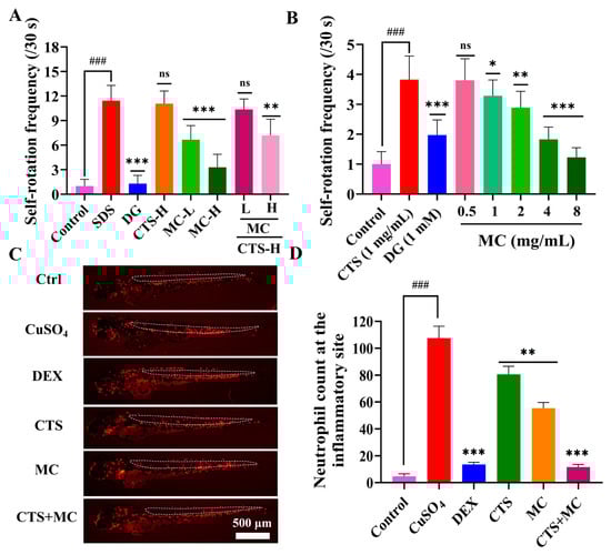 Meanwhile, medicine intervention groups were treated with positive drugs: dexamethasone (Dex, 5 μg/mL) and different concentrations of CTS (0–80 μg/mL), MC (0–800 μg/mL), and CTS-MC at varying concentration ratios; zebrafish were immobilized in 3% (w/v) methylcellulose-coated slides. Compounds were administered in a gradient dosing regimen at 5 min intervals. After 2 h of co-incubation with CuSO4 and treatments, neutrophil migration to the lateral line neuromasts was quantified using a stereo fluorescence microscope (Leica MZ10F, Germany). Successful model induction was confirmed by significant neutrophil infiltration into the dorsal neural tube (control baseline: 4.73 ± 0.48 cells/embryo).