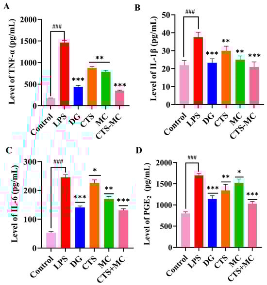Concentrations of TNF-α, IL-1β, IL-6, and PGE2 in the supernatants were quantified using commercial ELISA kits (Jiangsu Meimian Industrial Co., Ltd., Yancheng, China) according to the manufacturers’ protocols. Blank-well optical density (OD450) readings were subtracted from sample readings to obtain corrected OD values. Sample concentrations were determined by interpolating the corrected OD values into their respective standard curves. All samples and standards were analyzed in duplicate.