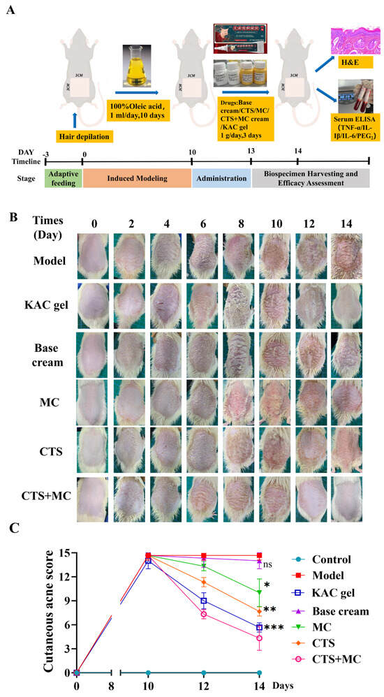 Inspired by the principle of functional complementarity [], this study aimed to establish a synergistic anti-acne strategy by combining CTS and MC. We hypothesized that CTS and MC could act synergistically: CTS providing potent antibacterial and anti-inflammatory activity, and MC mitigating toxicity while enhancing tissue repair. Therefore, we systematically evaluated CTS, MC, and their combination across in vitro cell models, zebrafish assays, and a rat acne model to assess pharmacological synergy, safety, and formulation feasibility.