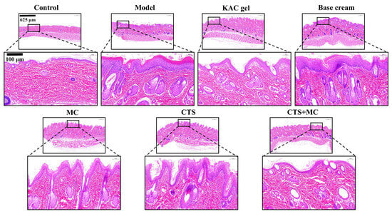 After acclimatization for 3 days, these rats were randomly assigned into 7 groups (n = 8) using a random number table to ensure unbiased allocation: (1) naive control, (2) untreated model, (3) positive control (KAC gel), (4) vehicle control (base cream), (5) MC monotherapy, (6) CTS monotherapy, and (7) MC-CTS combination therapy. Animals were housed under controlled conditions (temperature 22 ± 2 °C, relative humidity 55 ± 5%, 12 h light/12 h dark cycle), with ad libitum access to standard chow and water.