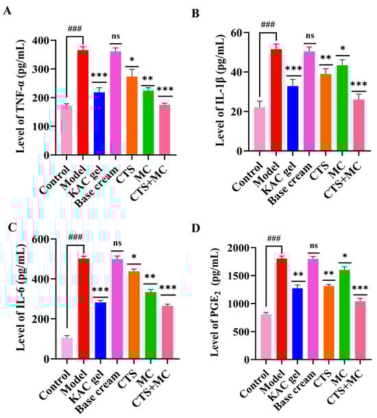 Blood samples were collected via cardiac puncture, and serum was isolated by centrifugation. The levels of inflammatory cytokines (TNF-α, IL-1β, IL-6, and PGE2) in the serum were quantified using specific commercial rat ELISA kits (Jiangsu Meimian Industrial Co., Ltd., Jiangsu, China) according to the manufacturer’s instructions.