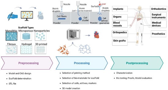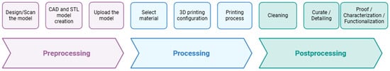 Additive manufacturing (AM) is the main principle of 3D printing. Unlike conventional manufacturing techniques, AM builds a three-dimensional structure by sequentially adding material layers. This layer-by-layer method enables the accurate formation of complex shapes and designs []. This general process is generally consistent across various applications (Figure 1), with differences primarily related to the specific technical design. It can be broadly categorized into three key stages, as outlined below: preprocessing, processing, and postprocessing.