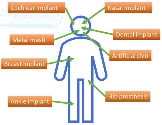 Some medical devices—such as orthopedic implants or those used in maxillofacial surgery, miniplates, screws, membranes, and metallic meshes employed in procedures of osteosynthesis, ligament stabilization, or bone augmentation—are manufactured from biomaterials, which are materials compatible with human tissues [,,].