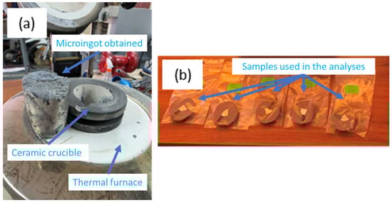 Example of ingot obtained after casting (a) and specimens for analysis (b).