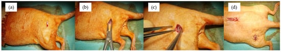 Rats underwent surgery under general anesthesia. The anesthetic protocol involved intramuscular injection of xylazine and ketamine, followed by maintenance of anesthesia using an inhaled mixture of oxygen and 1–2% isoflurane. Once anesthesia was induced, the rats were placed in a sternoabdominal recumbency on the surgical table, and the surgical site was disinfected with a betadine solution.