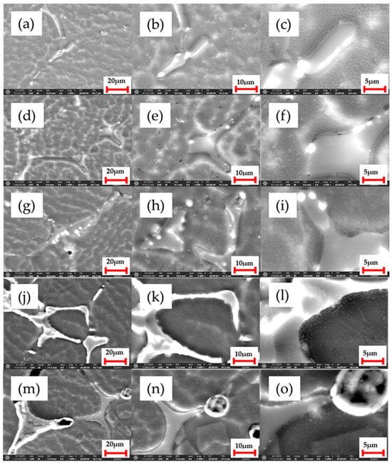 Figure 4 shows the microstructure details of the five studied alloys in the Mg-Ca-Sr systems with varying Sr concentrations (i.e., 0.5; 1; 1.5; 2; 3%).