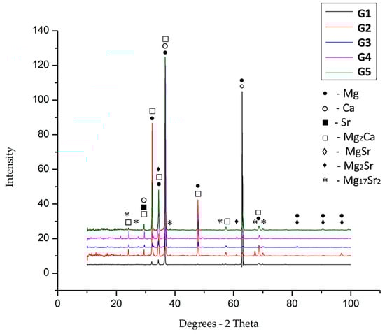The identification of the component phases for each experimental alloy was per-formed by X-ray diffraction, an analysis that reveals characteristic diffraction peaks. Chemical compounds such as Mg2Ca, MgSr, and Mg2Sr could be identified and of course, solid solution elements based on Mg, Ca and Sr. In Figure 5, the graphs for the five alloy systems are presented.