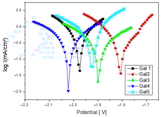 Tafel plots for the Mg-0.5Ca-xSr samples (x = 0.5; 1; 1.5; 2; 3%) in SBF electrolyte solution.