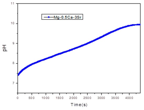 At higher Sr contents (x ≥ 1.5%), the corrosion rate increases progressively, reaching 11.81 mm/year at x = 3%. This increase can be attributed to the aggregation of Sr-rich secondary phases, which become electrochemically active and act as local cathodes, thus accelerating the anodic dissolution of the Mg matrix through a mechanism of microstructural galvanic corrosion. Therefore, an optimal compositional balance is observed around x = 1% Sr, where the corrosion rate is minimal, while exceeding this threshold leads to accelerated degradation. Figure 8, Shows the pH variation recorded during corrosion rate evaluation tests for sample G5 over 72.