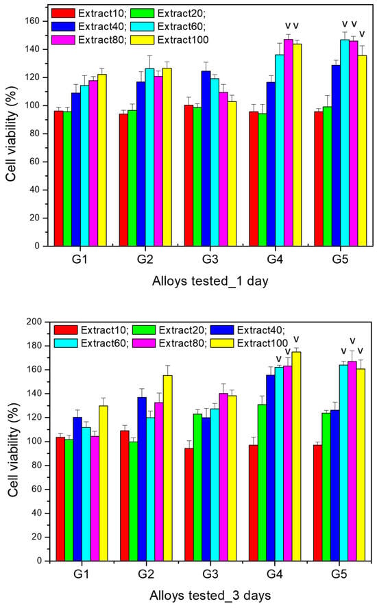 After 3 days of culture with the selected extracts (i.e., extract 10%, 20%, 40%, 60%, 80%, 100%) of the studied alloys, cell viability increased compared to the values recorded after one day and maintained the same trend of increasing viability with increasing extract concentration, with the increase being more significant starting from the 40% extract for all alloys. However, significantly higher values (p < 0.05) were recorded for alloys G4 (2% Sr) and G5 (3% Sr) for all the extracts studied, except for the 10% extract, for which the viability was not significantly different (p > 0.05) compared to the other studied alloys.