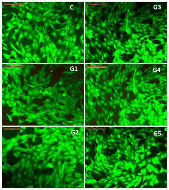 Images captured with the fluorescence microscope highlighting the morphology of MG63 cells co-incubated for 3 days with 100% extracts of each alloy in the studied Mg-0.5Ca-xSr system (i.e., G1 (0.5% Sr), G2 (0.1% Sr), G3 (1.5% Sr), G4 (2% Sr), G5 (3% Sr)), and the control well (C). Staining with Calcein-AM. Scale bar 200 µm.