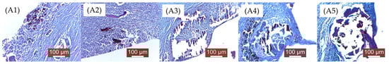 As mentioned in the Materials and Methods chapter, the groups were numbered as follows: A—2 weeks (A1, A2, A3, A4, A5), Figure 12; B—4 weeks (B1, B2, B3, B4, B5), Figure 13; C—12 weeks (C1, C2, C3, C4, C5), Figure 14. 1, 2, 3, 4, 5—the implanted materials with increasing concentrations of Sr.