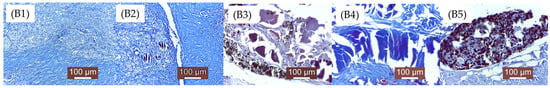 Histological aspects for samples (B1–B5) (i.e., Mg-0.5Ca-xSr alloys containing 0.5, 0.1, 1.5, 2, 3% Sr) after 4 weeks of implantation (see the text for details).
